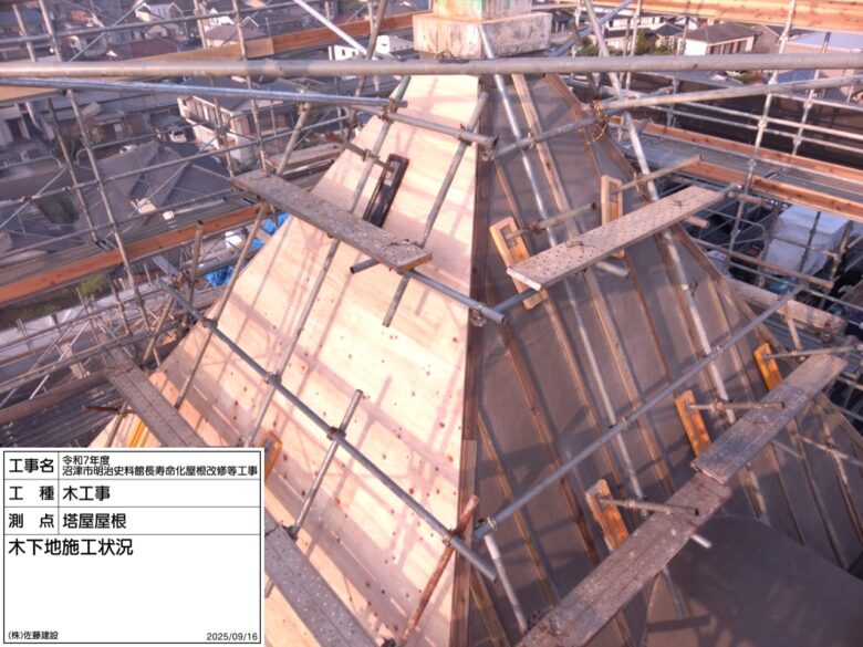 9月の主な工事内容:塔屋屋根仮防水工事,木下地工事,仕上工事・大屋根解体工事,仮防水工