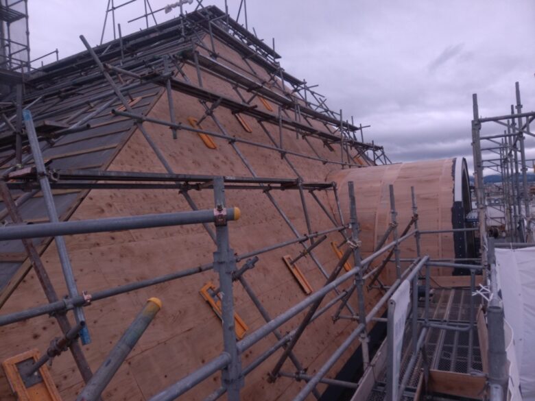 屋根の木下地工事は北、東、南面の3面が完了し、現在西面を施工中です。