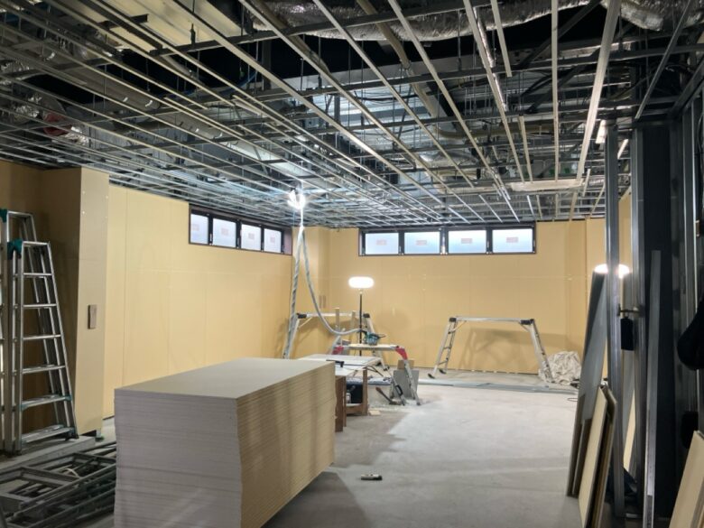 内装工事では各階天井・壁の軽量下地を組み、12月末からは1階の壁ボードを貼り始めました。