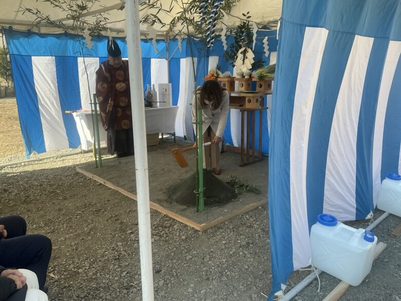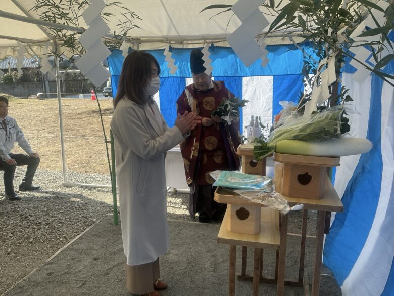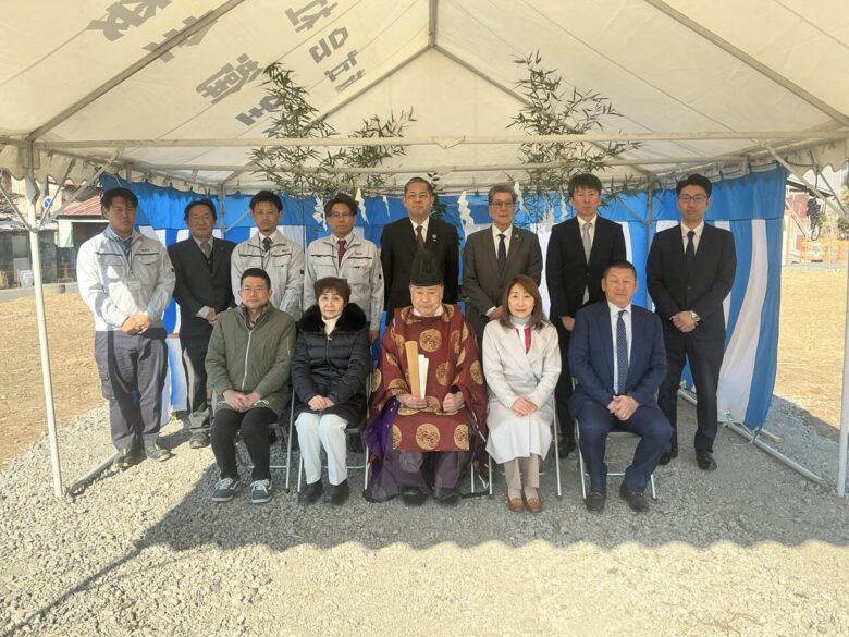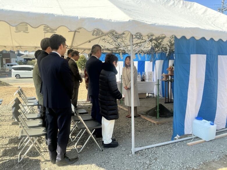 当日は、施主様をはじめ、関係者の皆様にご出席いただき、工事の安全と建物の無事完成を祈願いたしました。